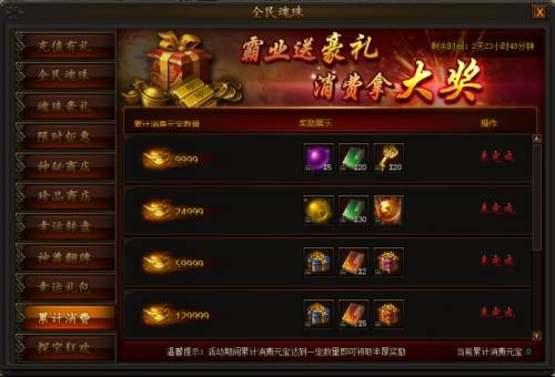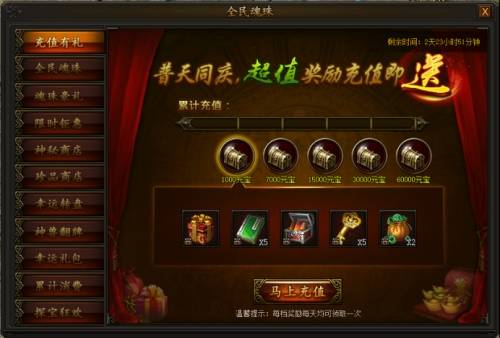 充值有礼 活动时间:2018年10月12日0点——10月14日23:59 活动期间,充值元宝即可领取五档丰厚奖励,每天均可领取一次,不容错过 全民魂珠 活动时间:2018年10月12日0点——10月14日23:59 活动期间,使用魂珠碎片大、中、小材料获得魂珠碎片,获得的魂珠碎片达到一定数量即可领取大量材料返还,获得碎片越多,返还材料越多,升级魂珠事半功倍! 魂珠豪礼 活动时间:2018年10月12日0点——10月14日23:59 活动期间,使用魂珠碎片大、中、小材料获得魂珠碎片,获得碎片数目达到6000即可参与碎片获得排行,有机会获得霸业装备、极品首饰奖励!活动结束后,奖励通过邮件发送。 奖励条件 奖励内容 魂珠豪礼第一名 霸业首饰任选箱*1、紫色地图线索宝箱*1、极品卡包*5 魂珠豪礼第二名 转10首饰任选箱*1、紫色地图线索宝箱*1、极品卡包*3 魂珠豪礼第三名 转8首饰任选箱*1、紫色地图线索宝箱*1、极品卡包*2 限时钜惠 活动时间:2018年10月12日0点——10月14日23:59 活动期间,材料礼包限时折扣,超低价格,不容错过! 神秘商店 活动时间:2018年10月12日0点——10月14日23:59 活动期间,每两小时神秘商店会自动刷新一批道具,也可花费元宝立即刷新,大量道具限时等你抢购。 珍品商店 活动时间:2018年10月12日0点——10月14日23:59 活动期间,每天会随机刷新一批特价道具,花费少量元宝即可购买,每个道具均有每天最大个人购买次数限制,部分道具有购买vip等级限制,买到就是赚到,机会不容错过! 幸运转盘 活动时间:2018年10月12日0点——10月14日23:59 活动期间,充值并消费一定元宝即可使用幸运转盘,获得大量元宝道具,使用获得元宝后即可前往商城内购买珍稀道具,精彩不容错过。 神兽翻牌 活动时间:2018年10月12日0点——10月14日23:59 活动期间,每充值1000元宝,可获得一次翻牌机会,抽取一张卡片;集齐各类卡牌,可组合兑换不同档次的奖励。 幸运礼包 活动时间:2018年10月12日0点——10月14日23:59 活动期间,每购买一次礼包可获得一次抽奖机会,还可花费元宝进行刷新!抽奖次数和礼包购买次数每日零点清零,请及时抽奖。 累计消费 活动时间:2018年10月12日0点——10月14日23:59 活动期间,累计消费一定数量元宝,即可领取对应档奖励,每个角色只能领取一次。 探宝狂欢 活动时间:2018年10月12日0点——10月14日23:59