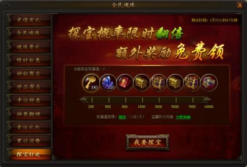 探宝超值回馈限时开启!活动期间探宝可获得祝福值,祝福值达到一定数值即可领取霸业装备奖励!
