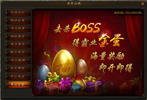活动期间,击杀BOSS可获得霸业金蛋,打开即可获得转生丹、经验丹和绑定元宝奖励。