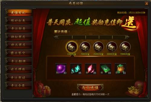 活动期间,充值元宝即可领取五档丰厚奖励,每天均可领取一次,不容错过!