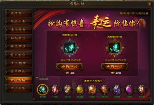 活动期间,每天会随机刷新一批特价道具,花费少量元宝即可购买,每个道具均有每天最大个人购买次数限制,部分道具有购买vip等级限制,买到就是赚到,机会不容错过!