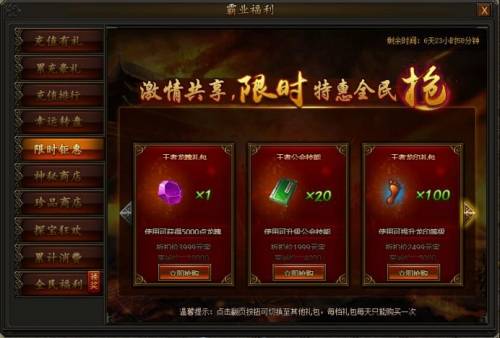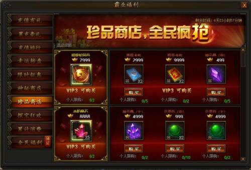活动期间,每天会随机刷新一批特价道具,花费少量元宝即可购买,每个道具均有每天最大个人购买次数限制,部分道具有购买vip等级限制,买到就是赚到,机会不容错过!