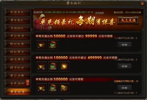 活动期间,单笔充值元宝数量满足对应条件,即可领取超值反馈,每档奖励均有全服和个人领取次数限制!