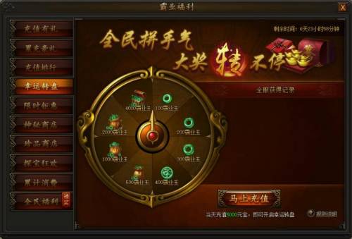 活动期间,充值并消费一定元宝即可使用幸运转盘,获得大量霸业玉道具,使用霸业玉后即可前往霸业商城内购买珍稀道具,精彩不容错过。