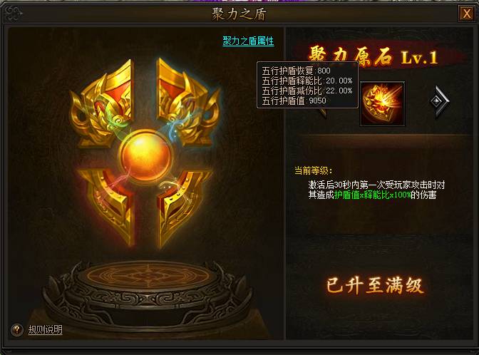 Ø     能量之盾:可直接抵消固定数值的五行伤害,消耗一定数量的聚力碎石和能量之石可对能量之盾进行培养,培养后可提升五行护盾能量最大值;
